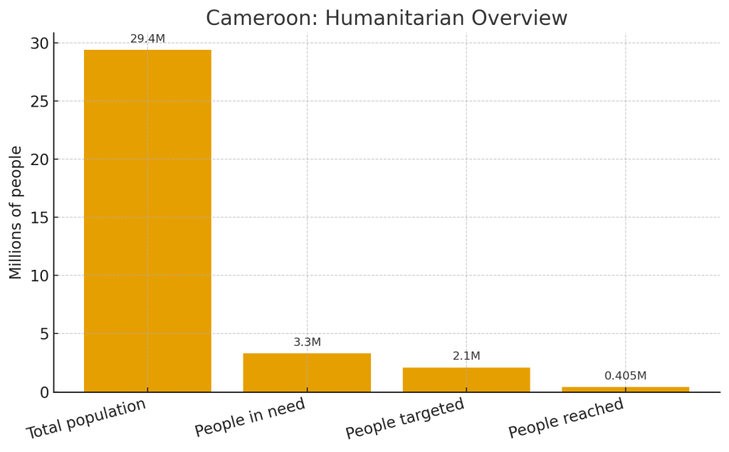 The humanitarian situation in Cameroon is currently not a good one. According to UNICEF, “Cameroon continues to face the compounded effects of three concurrent and protracted humanitarian crises: the Lake Chad Basin conflict, the North-West (NW) and South-West (SW) crises, and the impact of the presence of Central African refugees in the eastern regions.” Statistics on humanitarianaction.info as of October 8, 2025 says out of Cameroon’s 29.4 million population, there are 3.3 million people in need, with 2.1 million people targeted and only 404.8 thousand reached so far. The chart below gives a clearer view of the situation: